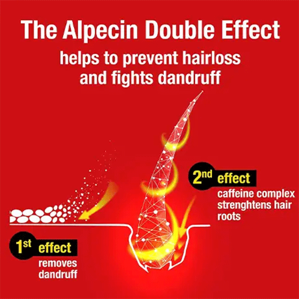 شامپو ضد ریزش کافئین دابل افکت آلپسین حاوی مقادیر بالایی از کافیین می باشد که در هنگام شستشو موها به ریشه های مو نفوذ می کند و پس از 2 دقیقه کافیین ، روی ریشه های مو قابل ردیابی است.